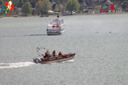 Kurz nach Beginn der Arbeiten war am Traunsee ein brennendes Linienschiff zu sehen, aufgrund dessen wurden die Feuerwehren Traunkirchen, Altmünster, und Gmunden jeweils mit A-Boot, sowie die Feuerwehren Rindbach und Langwies alarmiert. Da auch einige Personen ins Wasser gesprungen waren, mussten diese gerettet und an Land gebracht werden. Zur Brandbekämpfung wurde eine Tragkraftspritze auf ein A-Boot verladen, zeitgleich suchten Atemschutztrupps das Schiff nach Verletzten ab und brachten diese in Sicherheit. Nachdem der angenommene Brand unter Kontrolle bzw. gelöscht war, konnten ein Team des Roten Kreuzes und ein Notarzt auf das Schiff gebracht werden, um die Verletzten zu versorgen und anschließend alle Personen an Land gebracht werden.Während der Arbeiten auf dem Wasser konnten die Personen aus den Unfallfahrzeugen befreit werden, die Verletzten wurden von der Bergrettung Ebensee über die Böschung zum See abgeseilt und mittels A-Boot abtransportiert.