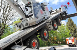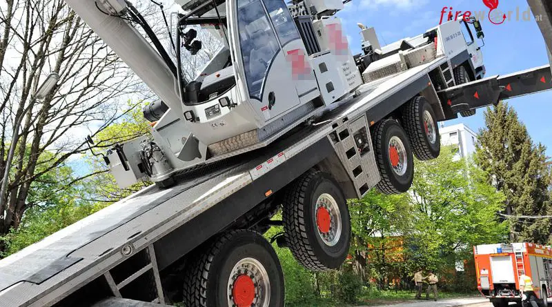 Der 52-jährige Fahrer eines 60 Tonnen Kranes wollte eine Palette mit Steinenverfahren, als sein Kran in Lastrichtung umfiel. Zwei Bauarbeiter auf dem Dach der Baustelle konnten sich gerade noch in Sicherheit bringen, als der tonnenschwere Ausleger größtenteils auf dem Baugerüst, als auch an der Dachseite einschlug und dort zum liegen kam.