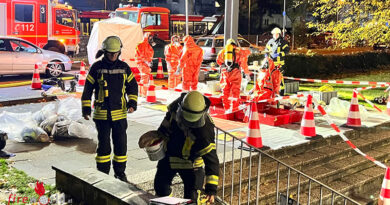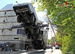 Die Palette kam auf dem Dach zu liegen. Durch diesen glücklichen Zufall fielen keine Teile auf die Fahrbahn. Der Kranführer selbst wurde in seiner Kabine eingeschlossen. Nach Sicherungsmaßnahmen durch den alarmierten Feuerwehrkran konnte er völlig unverletzt aus seiner Zwangslage gerettet werden. Die Bergung des verunfallten Kranes übernahm die Fachfirma mit zwei 100 Tonnen Kränen.