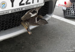 )wurde von der Berufsfeuerwehr Augsburg vorsichtig befreit, dazu mussten Kühlergrillteile entfernt werden. Die Ente wurde zur Tierklinik gebracht. Sie hat vermutlich keine schweren, lebensbedrohlichen Verletzungen.