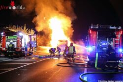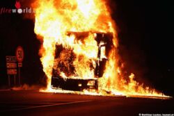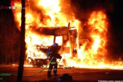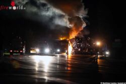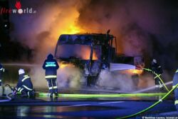 Vermutlich aufgrund eines technischen Defekts geriet die Schwerlastzugmaschine in Brand. Die Mitarbeiter konnten die transportierte Last im letzten Moment noch abkoppeln und ein Stück zurückziehen. Die Zugmaschine brannte vollständig aus. Die Feuerwehr stand im Großeinsatz. Zudem musste anschließend ausgelaufener Diesel gebunden werden.