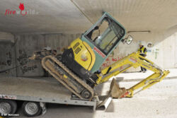 Beim Einfahren in die Unterführung blieb der Kettenbagger auf dem Anhänger mit dem Kabinendach an der Decke hängen. Daraufhin rutschte dieser schlagartig nach hinten und hob des Heck vom Zugfahrzeug, einen Q7, um circa einen halben Meter nach oben. Nach ersten Stabilisierungsmaßnahmen wurde der Pkw mit mehreren Hebekissen hochgehoben um vom Anhänger getrennt. Der Bagger wurde abschließend mit der Winde des Rüstwagens in die Ausgangsposition zurückgezogen. Der Sachschaden kann noch nicht beziffert werden.