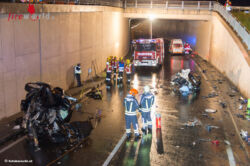 PASCHING (OÖ): Zu einem schweren Verkehrsunfall kam es Freitagabend, den 1. Mai 2015, im Tunnelportal unter dem OÖN-Kreisverkehr in Pasching.