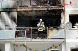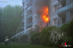 Um an der Fassadenfront eine weitere Ausbreitung zu verhindern, setzten die Einsatzkräfte sofort ein B-Rohr von außen ein. Parallel dazu ging ein Trupp, geschützt mit schwerem Atemschutz, zur Brandbekämpfung mit einem C-Rohr über das Treppenhaus zum Brandherd vor. Weitere Atemschutztrupps kontrollierten das völlig verrauchte Treppenhaus und alle Wohnungen des Mehrfamilienhauses.
