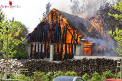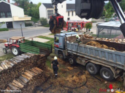 Zuerst wurde das Umfeld gekühlt um eine Brandausweitung zu verhindern, bevor der direkte Brandherd gelöscht wurde. Nach Ablöschen der Flammen mußte das Stroh auseinandergenommen und separat abgelöscht werden. Dazu wurde das Brandgut mit dem Greifer des Schweren Rüstfahrzeuges aufegnommen und auf einen Anhänger verlastet. Zur Unterstützung dieser zeitintensiven Arbeit wurde noch ein zweiter Lkw mit Kran und Greifer hinzugezogen.