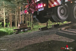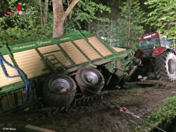 Der Heuladewagen wurde am Heck angeschlagen, aus dem Straßengraben gehoben und das Traktorgespann wieder gerade gestellt. Dies bedeutete auch viel Fingerspitzengefühl seitens des Kranführers der mit dem Ausleger zwischen den Bäumen und Ästen manövrieren musste. Nach der Beendigung der Arbeiten konnten beide eingesetzten Feuerwehren um ca. 03:50 Uhr wieder einrücken.