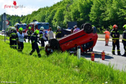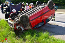 Ein Augenzeuge, der auf der Gegenfahrbahn unterwegs war (er hatte auch den Notruf der Feuerwehr gewählt), berichtet der Feuerwehr, dass dieser Unfall „filmreif“ war – plötzlich sah er, wie ein Auto in der Luft ist und sich überlägt. Das Fahrzeug ist gegen einen Wasserdurchlass geprallt. Dadurch wurde das Auto in die Luft katapultiert und kommt schließlich auf der ersten Fahrspur in einer unübersichtlichen Kurve am Dach zu liegen.
