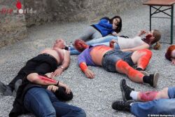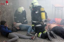 Die ATS-Trupps trafen sich im ersten Innenhof beim Atemschutzsammelplatz. Dort wurden die Trupps auf ihre Vollständigkeit kontrolliert und abwechselnd mit Tragetüchern zu den Verletzten geschickt. All dies geschah unter den wachsamen Augen von ABI Ewald Tiess. Bereits gegen 18.45 Uhr konnten alle Verletzten aus dem Gefahrenbereich geborgen werden und alle Personen wurden der Rettung zur weiteren Behandlung übergeben.
