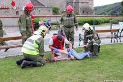 Nach der Übung erfolgte die Übungsnachbesprechung im Innenhof der Burg. FF KdtStv BI Baier bedankte sich bei allen Anwesenden für die Bereitschaft zur Durchführung der Übung. Auch der Vertreter der Esterhazy Verwaltung bedankte sich bei allen Anwesenden. Weiters sprach auch Bgm. Friederike Reismüller allen einen Dank aus und lobte die anwesenden Einsatzkräfte für ihre Tätigkeiten bei der Feuerwehr und Rettung und für die tadellos durchgeführte und wichtige Übung auf der Burg Forchtenstein, da hier natürlich regelmäßig Veranstaltungen stattfinden. ABI Ewald Tiess war vom Übungsablauf begeistern und gratulierte allen Teilnehmern auf das herzlichste für ihre Leistungen.