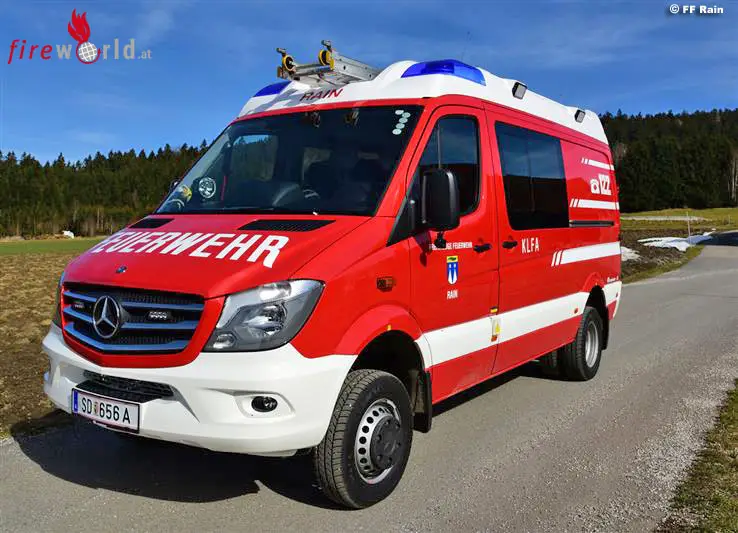 Auf Basis eines Mercedes Benz Sprinter 519 CDI 4×4 baute die Fa. Rosenbauer ein maßgeschneidertes Einsatzfahrzeug mit einem modernen und zukunftsweisenden System für die FF Rain auf. Ein Lichtmast mit LED-Beleuchtung und ein großzügig dimensioniertes Stromaggregat bilden das Rückgrat einer eigenständigen Licht- und Energieversorgung an der Einsatzstelle. Die Normausstattung mit Schläuchen, Rettungsgeräten und dergleichen komplettiert das neue Fahrzeug und ist nun für das gesamte Einsatzspektrum – Brände und technische Einsätze, z.B. Sturm- und Hochwasserschäden – bestens gerüstet.