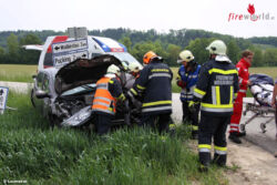 Ein Postfahrzeug wurde in ein angrenzendes Feld geschleudert. Eine Person erlitt mittelschwere, der zweite Fahrzeuglenker leichte Verletzungen. Die Verletzten wurden vom Rettungsdienst und der Notärztin versorgt. Die Feuerwehr unterstützte die Rettung der Verunfallten aus den Fahrzeugen und unterstützte das Abschleppunternehmen bei den Aufräumarbeiten.