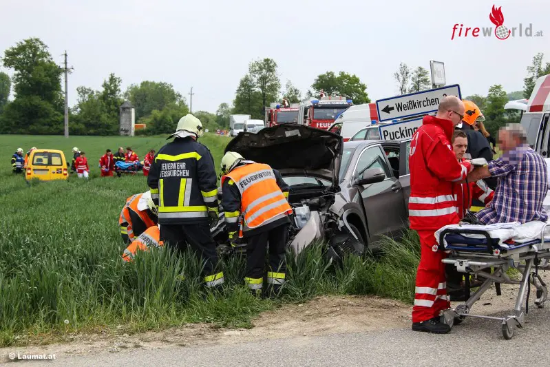 WEISSKIRCHEN (OÖ): Zwei Verletzte forderte Mittwochmittag, 13. Mai 2015, ein Verkehrunfall auf der Traunuferstraße im Gemeindegebiet von Weißkirchen an der Traun (Bezirk Wels-Land). Im Kreuzungsbereich Traunufer-Puckinger Straße mit den Zufahrtsstraßen Hetzendorf und Untersinnersdorf kollidierten zwei Pkw.