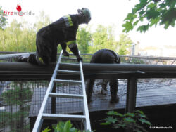 Ein aufmerksamer Bürger hatte in den frühen Morgenstunden entdeckt, dass sich ein Waldrapp über den hölzernen Vogelkästen im oberen Netz verfangen hatte. Da mit der Drehleiter der Einsatzort nicht erreicht werden konnte, entschied der Einsatzleiter die Tierrettung über die Rückseite des Geheges durchzuführen. Drei Feuerwehrmitglieder marschierten über die Böschung auf die Rückseite und stiegen mit einer Leiter zum Waldrapp. Rasch wurde der offensichtlich leicht verletzte Vogel aus seiner misslichen Lage befreit.