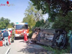 Die mitfahrende Tochter konnte vorher bereits durch Ersthelfer aus dem Gurt befreit und in Sicherheit gebracht werden. Die beiden Insassen wurden vom Notarzt und Sanitätern des Roten Kreuzes versorgt. Von uns wurde das Fahrzeug aufgestellt. Außerdem wurde der Brandschutz aufgebaut und die Unfallstelle abgesichert. Nach dem Eintreffen der Feuerwehren aus Moosbach und Weng wurde die Einsatzstelle an die zuständige FF Moosbach übergeben, welche die Aufräumarbeiten durchführte.