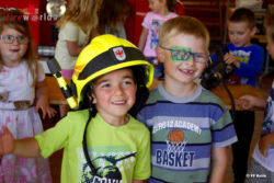 Zuerst bekamen die Kinder eine kleine Präsentation über die Aufgaben der Feuerwehr, die Gefahren von Feuer und Rauch sowie den wichtigsten Verhaltensregeln bei einem Brand. Anschließend konnten sich die kleinen Feuerwehrfrauen und -männer selbst ein Bild von der Schutzausrüstung und den Fahrzeugen machen. Natürlich durfte auch das Spritzen mit dem großen Feuerwehrschlauch und die Fahrt mit dem Feuerwehrauto nicht fehlen.