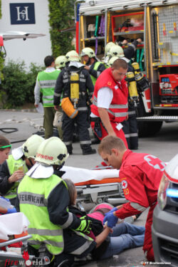 Als weitere Übungseinlage "verunglückte" einer der Atemschutztrupps und musste von zwei Rettungstrupps mit Atemluft versorgt werden und anschließend mittels Hebekissen befreit sowie gerettet werden. Im Laufe der weiteren Brandbekämpfung meldete die Teleskopmastbühne -Neusiedl den Einsturz des Hallendaches, woraufhin die Halle evakuiert und der Außenangriff erweitert wurde. Nach der Meldung "Brand aus", war die Übung beendet.