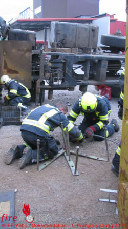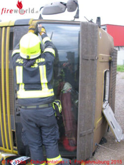 Sofort nach Eingang der Meldung rückte das schwere Rüstfahrzeug (SRF) zum Übungsort aus, bereits kurze Zeit danach machten sich unser Tanklöschfahrzeug (TLF) und das Versorgungsfahrzeug (VFA) auf den Weg. Bei Ausrückung des Kommandofahrzeuges (KDOF) erhielten wir bereits durch den ersteintreffenden Gruppenkommandanten, BM Markus Fischl, die Meldung, dass es sich um ein umgestürztes Wechselfahrzeuges mit einer eingeklemmten Person handelt. Über das Dachfenster der Kabine schafften wir einen Erstzugang und ein Kamerad übernahm die Betreuung des Eingeklemmten. Um die Person vor Glassplittern und Metallspänen zu schützen, wurde eine Plane über die Person und Kamerad FM Markus Peham gezogen. Nach Entnahme der Frontscheibe wurde die Person, nachdem die Hand, durch Anheben der Kabine, mittels hydraulischen Rettungsgeräts befreit wurde, auf dem Spinboard gerettet werden.