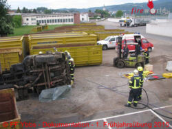 Ein Wechselladefahrzeug war bei Manipulationsarbeiten an den Containern umgestürzt und der Fahrer unter der Kabine eingeklemmt.
