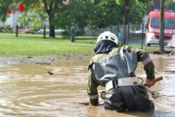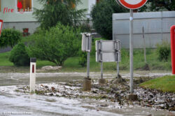 Mit Sturm, Starkregen, Blitz und Donner, zum Teil sogar Hagel. Vor allem im Großraum Kirchbach und St. Stefan sowie Feldbach gab es – entlang des Raabtals – bis nach Fehring für die Einsatzkräfte einiges zu tun. Durch die Wassermassen, vereinzelt wurde von 50 Liter berichtet, waren die Kanäle überfordert, konnten das Wasser nicht mehr aufnehmen. Viele Gemeinde- und Landesstraßen wurden dadurch kleinräumig überflutet. Oder mit Schlamm bzw. Erdmassen von den Äckern überspült. Vereinzelt galt es auch Keller und Hauseinfahrten sowie Betriebsanlagen auszupumpen. In Leitersdorf im Raabtal ergossen sich die Wasser- und Schlammmassen beispielsweise über den örtlichen Sportplatz. Bis zu den Hüften standen hier Feuerwehrmitglieder auf der gegenüberliegenden Straßenseite im Wasser, um Schächte freizuräumen und ein kontrolliertes Abrinnen zu ermöglichen.