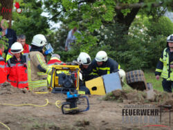 Bei Erdarbeiten war hier ein Bagger umgekippt und hatte den Baggerfahrer mit einem Arm und einem Fuß eingeklemmt. Durch den Rettungsdienst wurde der Verletzte vor Ort versorgt, während die Feuerwehr den Bagger stabilisierte, um eine Rettung der Person durchzuführen. Mit Hilfe von Hochdruckkissen und hydraulischem Rettungsgerät konnte der Bagger angehoben und die Person befreit werden.