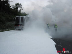 Vor Ort eingetroffen waren alle Insassen bereits in Sicherheit und wurden von den eingetroffenen Autobahnpolizisten betreut. Als erste Löschmaßnahme wurden die Flammen von einem Dachwerfer aus mit Schaum bedeckt. Anschließend ging ein Atemschutztrupp unter Umluft unabhängigen Atemschutz zur Brandbekämpfung vor. So konnte der Brand von innen in kurzer Zeit gelöscht werden. An dem Reisebus entstand jedoch Totalschaden.