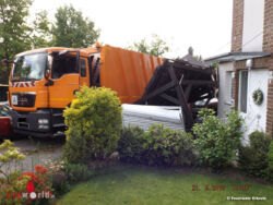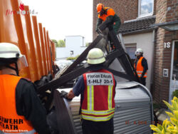 Der 3-achsige LKW schob vier geparkte PKW ineinander und zerstörte ein Carport vollständig, bevor das schwere Fahrzeug in einem Trümmerfeld zum stehen kam. Weiterhin wurde der Anbau eines Zweifamilienhauses beschädigt und eine Straßenlaterne überrollt. Da die Stromversorgung der Laterne abgerissen war und das Kabel unter Strom stand, wurden die Stadtwerke Erkrath zur Einsatzstelle nachalarmiert. Die Unfallstelle wurde zunächst durch die Einsatzkräfte der Feuerwehr abgesichert. Zur Bergung der Fahrzeuge musste das zerstörte Carport mit einer Motorkettensäge entfernt werden.