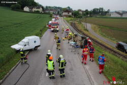 Eine schwangere Frau und ihr Ehemann waren wegen beginnender Wehen auf dem Weg ins Krankenhaus. In Richtung Aisthofen verloren sie aufgrund überhöhter Geschwindigkeit die Kontrolle über ihr Fahrzeug und prallten gegen ein entgegenkommenden PKW mit zwei Insassen. Der Pkw des Ehepaares überschlug sich und kam auf der Fahrerseite zum Liegen. Der zweite PKW überschlug sich ebenfalls und kam am Dach liegend in der Böschung zum Stillstand. Ein nachkommender weißer Transporter mit weiteren zwei Insassen konnte nicht mehr rechtzeitig anhalten und verriss sein Fahrzeug in den Straßengraben. Die Schwangere und ihr Ehemann, sowie Fahrer und Beifahrer des am dachliegenden Fahrzeuges wurden teils schwer verletzt im Fahrzeug eingeklemmt. Die Insassen des Transporter wurden nur leicht verletzt.