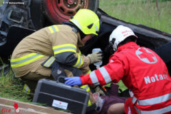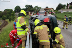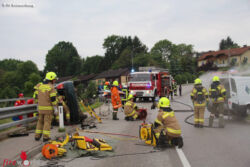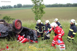 Am Einsatzort eingetroffen wurde vom Einsatzleiter Schwertberg die Lage erkundet und gemeinsam mit dem bereits anwesenden Sanitätern das weitere Vorgehen besprochen. Innerhalb kürzester Zeit war auch die erste Fahrzeugbesatzung der FF Perg am Einsatzort. Gemeinsam wurde entschieden die Einsatzstelle in zwei Bereiche zu teilen. Während sich die Kameraden der FF Perg, um das verunfallte Ehepaar kümmerte, schafften wir, bei dem auf dem Dach liegendem Fahrzeug, den Erstzugang für das Notarztteam. In weitere Folge unterstützten wir, gemeinsam mit der FF Perg die Rettung der verunfallten Personen.