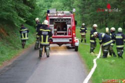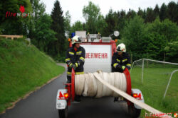 Schon während der Anfahrt wurde die Mannschaft von TLF und KLF eingewiesen und die Aufgaben verteilt. TANK-Hinterberg hatte die Aufgabe mit einen ATS-Trupp die Brandbekämpfung im Innenagriff durchzuführen, einen Verteilerangriff mit einem C-Rohr im Aussenbereich durchzuführen, den neuen Wasserwerfer vom LAST Tragwein mit Wasser zu versorgen, und den Falttank beim LFB Tragwein zu positionieren. die Mannschaft vom MTF half dabei. Unser KLF wurde eingeteilt bei der 1100 Meter langen Zubringerleitung eine TS zu stellen und ein 540 Meter langes Teilstück der Schlauchleitung zu legen. Ca. 25 Minuten nach Alarmierung war die Zubringerleitung fertig gestellt und das Wasser beim Falttank der durch das LFB Tragwein als Wasserverteilerstation betrieben wurde.