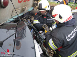 Nach kurzer Rücksprache mit dem Einsatzleiter der ÖBB wurde der Pkw unter Zuhilfenahme des hydraulischen Rettungsgerätes vom Triebwagen getrennt und mit Hilfe der Seilwinde aus dem Gleiskörper entfernt.