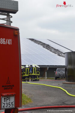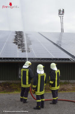 Daher auch die massive Rauchentwicklung. Die Feuerwehr nahm mit drei C-Rohren die Brandbekämpfung auf und konnte so das Feuer schnell eindämmen. Abschließend wurde von der mittlerweile eingetroffenen Drehleiter der FF Barmstedt ein Wenderohr vorgenommen, um die Dachfläche weiter zu kühlen. Der Bereich wurde mit der Wärmebildkamera kontrolliert. Die Kräfte aus Lutzhorn und Klein Offenseth-Aspern brauchten nicht mehr tätig zu werden und konnten nach etwa 45 Minuten Bereitstellung aus dem Einsatz entlassen werden. Die FF Groß Offenseth-Aspern stellte über den Vormittag noch eine Brandwache, bis eine Fachfirma an der Solaranlage tätig wurde. Zur Höhe des Sachschadens kann die Feuerwehr keine Angaben machen. Die erhaltenen Werte aber dürften im sechsstelligen Euro-Bereich liegen. Brandursache ist wahrscheinlich ein technischer Defekt.