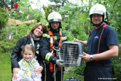 Mit einer Tierrettungsbox wurde die Samtpfote zu Boden gelassen und den überglücklichen Besitzern übergeben.