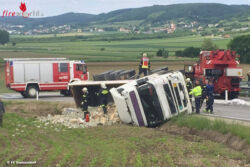 Mithilfe des Kranfahrzeuges der Freiwilligen Feuerwehr St. Pölten-Stadt wurde der Lkw aufgerichtet. Um den ausgeflossenen Treibstoff zu binden, stand auch ein Schadstofffahrzeug im Einsatz.