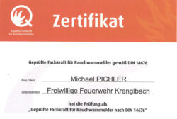 KRENGLBACH (OÖ): Brandrauch tötet – Brandschutz auch im Eigenheim. Um beim vorbeugenden Brandschutz mit der Zeit zu gehen, Wissen aufzufrischen und auch weitergeben zu können besuchte der stellvertretende Feuerwehrkommandant von Krenglbach, OBI Pichler Michael, im Mai 2015 – als Mitglied von Brandschutzforum Austria – die vereinsinterne Fortbildungsveranstaltung „Geprüfte Fachkraft für Rauchwarnmelder DIN 14676“.