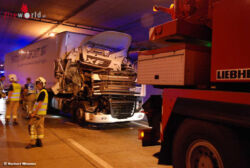 Der Aufleger wurde durch eine Fachfirma abgeholt. Nach rund zwei Stunden konnte der Einsatz beendet werden und die insgesamt 27 Mitglieder mit deren sechs Fahrzeugen wieder in die Feuerwehrhäuser einrücken.