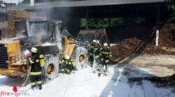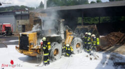 Von den weiteren eingetroffenen Feuerwehren wurde eine Löschwasserversorgung errichtet und weitere Atemschutz Trupps bereitgestellt. Es konnte ein Übergreifen der Flammen auf ein Gebäude und auf einen großen Haufen Sägespänne verhindert werden. Beim Radlader entstand Totalschaden, verletzt wurde allerdings niemand.