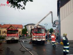 Gleichzeitig dazu wurde auch aus einem Innenhof über Steckleitern ein Angriff an der Rückfront des Gebäudes vorgenommen. Durch die Bauweise kam es allerdings immer wieder zum Auftreten weiterer Brandherde. In Zusammenarbeit mit der Drehleiter Schrems konnte das Dach an der Rückfront großflächig geöffnet werden, STEIG Gmünd führte die gleichen Arbeiten an der Vorderfront durch. Unter Verwendung zweier Schwerschaumrohre gelang es dann, die Glutnester weitgehend abzulöschen. Das erforderliche Schaummittel stellte TANK 3 bereit. Gegen 22.00 Uhr konnten die Einsatzkräfte wieder in die Zentrale einrücken.