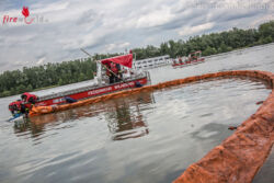 Gestartet wird am Rande der Schiffsfahrgasse (dort lässt sich ein Anker noch effektiv setzen) mit zwei Anker, welche mit Ketten verbunden sind, also 25 kg Anker setzen, Kette, wieder 25 kg Anker setzen, gefolgt vom Setzen eines 75 kg wiegenden Ankers. Damit wird der dann über eine Boje angebrachte Ölsperre, welche von einem weiteren Boot vom Kranfahrzeug abzuholen und dann auszurollen ist (75 m Länge) ausreichend Halt geboten. Die zweite Ölsperre wird etwas weiter flussabwärts und weiter in Richtung Ufer gesetzt. Hier reichen kommt dann aufgrund der schon geringeren Strömung ein 25 kg Anker weniger zum Einsatz bzw. wurde im vorliegenden Fall nur ein 75 kg Anker verwendet. Per Boot und Motorseilwinde wurden die Sperren dann entsprechend gestrafft.