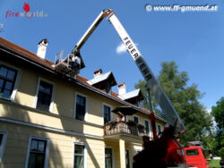 Eine Katze war in der Zwischendecke im Bereich des Dachgeschosses eines mehrstöckigen Wohnhauses gefangen. Eine Zugriffsmöglichkeit war nur durch die Verwendung der Teleskopmastbühne gegeben, da zur Rettung des Tieres mehrere Ziegel entfernt werden mussten.