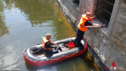 Zwei Feuerwehrmänner mussten zunächst mit einem Boot bis zu dem vergitterten Fenster paddeln und konnten dann unter den Augen vieler Sonntagsspaziergänger die Entenküken mit einem Kescher aus ihrem Gefängnis befreien und anschließend in die Obhut der Entenmutter übergeben. Neben der Bochumer Tierrettung war die Feuerwehr mit insgesamt 11 Einsatzkräften vor Ort. Gegen 14:45 Uhr war der Einsatz beendet.