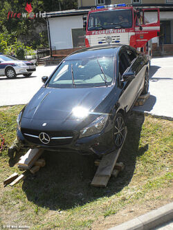Jedoch genau in der größten Mittagshitze, bei 32°C Lufttemperatur wurde die FF Bad Aussee am 6. Juni 2015 gegen 13.00 Uhr, zu einer Fahrzeugbergung alarmiert! Beim Unimarktparkplatz fuhr ein Fahrzeuglenker geradewegs in ein sogenanntes Sickerbecken und blieb mit dem gesamten Frontbereich im Graben stecken.
