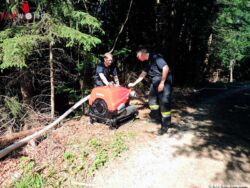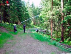 Ein Löschwassercontainer in der Nähe der Einsatzleitstelle bildete den Wasserpuffer für die Löschmannschaften. Der Waldbrand-Zug erhielt die Aufgabe, vom Bassin eine 1.400m lange Zubringerleitung in den Einsatzbereich zu verlegen. Dabei waren über 200m Höhenunterschied zu bewerkstelligen, was bei der Ermittlung der einzusetzenden Verstärkerpumpen zu berücksichtigen ist. Der Tanklöschfahrzeug-Zug hatte den Wasserbehälter unentwegt zu befüllen, wobei vorausschauend für alle eingesetzten Feuerwehrkräfte ein Einbahnsystem eingeführt wurde. In angemessener Zeit konnten die Schlauchlinien entwickelt und das Wasser zu den Strahlrohren gepumpt werden. Nach drei anstrengenden Stunden konnte das erlösenden Kommando „Wasser halt! Zum Abmarsch fertig!“ gegeben werden.