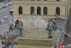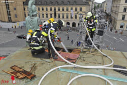 - Am Odeonsplatz schlug der Blitz auf das Dach des sogenannten Hofgartentores. Dabei durchschlug der Blitz das Blechdach und entzündete einen darunter liegenden Balken des Dachstuhles. Nachdem von Passanten eine Rauchentwicklung festgestellt wurde alarmierten sie die Feuerwehr. Von den Einsatzkräften wurde mit einem Trennschleifer die Dachhaut aufgeschnitten. Anschließend konnte der Schwelbrand abgelöscht werden. Provisorisch wurde nach den Löscharbeiten das Dach mit Planen gesichert. Der entstandene Schaden kann von der Feuerwehr nicht beziffert werden.