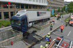 Bayern: Sattelzug kommt von der Fahrbahn ab und bleibt auf Fußgänger-Unterführung stehen