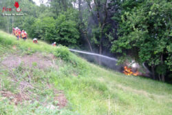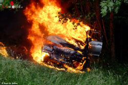 GAMS (SCHWEIZ): Kurz nach 14:45 Uhr ist am 9. Juni 2015 ein 48-Jähriger mit seinem Lieferwagen auf der Hinderbergstraße in Gams einen Hang hinuntergerollt. Anschließend fing der Wagen aus bisher unbekannten Gründen Feuer. Der Mann erlitt leichte Verletzungen.
