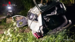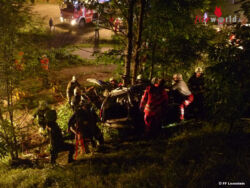 Ein PKW mit drei Personen der auf der B140 Richtung Kirchdorf unterwegs war, kam aus noch unbekannter Ursache von der Fahrbahn ab und stürzte über eine steile Böschung. Der PKW prallte gegen einige Bäume und verfing sich letztendlich darin. Drei verletzte Personen mussten mittels zwei hydraulischen Rettungsgeräten von den Feuerwehren aus dem stark demolierten PKW gerettet werden.