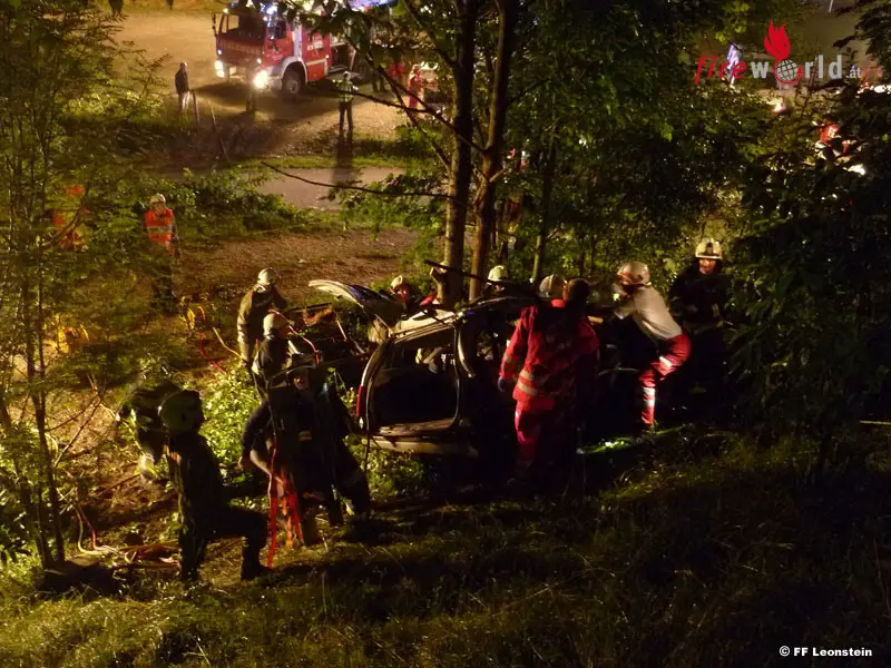 Ein PKW mit drei Personen der auf der B140 Richtung Kirchdorf unterwegs war, kam aus noch unbekannter Ursache von der Fahrbahn ab und stürzte über eine steile Böschung. Der PKW prallte gegen einige Bäume und verfing sich letztendlich darin. Drei verletzte Personen mussten mittels zwei hydraulischen Rettungsgeräten von den Feuerwehren aus dem stark demolierten PKW gerettet werden.