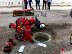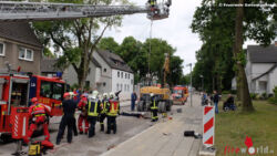 GELSENKIRCHEN (DEUTSCHLAND): Gegen 14.00 Uhr ist die Feuerwehr Gelsenkirchen am 16. Juni 2015 zu einer schwierigen Personenrettung aus einem 3m tiefen Schacht gerufen worden. Während der Bauarbeiten am Abwasserkanal unter der Mühlenstraße ist in Hassel ein Bauarbeiter in den 3m tiefen Schacht gestürzt.