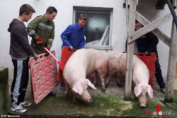 Zu Beginn wurde das Wesen der Schweine erklärt, weiters diskutierten wir über das Verhalten der Tiere bei Gefahrensituationen. Nach einem Rundgang im Betrieb wo unter anderem über die Brandabschnitte und Fluchtwege gesprochen wurde, ging es in die schon mit Spannung erwartete Praxis.