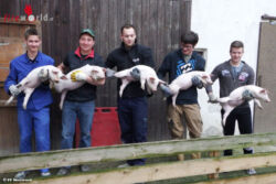 Zum Abschluss wurde mit kleineren Ferkeln gearbeitet. Die Ferkel wurden im Hof frei gelassen und mussten von den Mitgliedern eingefangen werden. Nach einer kurzen Einführung über die richtige Tragetechnik konnten die Feuerwehrleute gemeinsam alle Tiere in den sicheren Stall bringen.